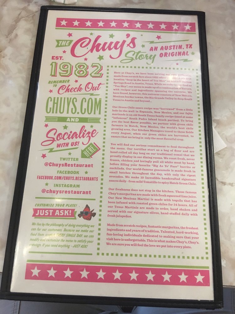Introducing the menu at Chuy's Rogers, a vibrant Tex-Mex bar located in Rogers, AR. This culinary gem brings a delightful experience, blending traditional Mexican flavors with a modern twist. The menu showcases highlights like the Green Chile Combo, featuring creamy green chile chicken enchiladas paired with a chile relleno, alongside Mexican rice and refried beans. For families, the Fajita Kit serves up a hearty meal for four, complete with flavorful fajitas, fresh toppings, and homemade tortillas.